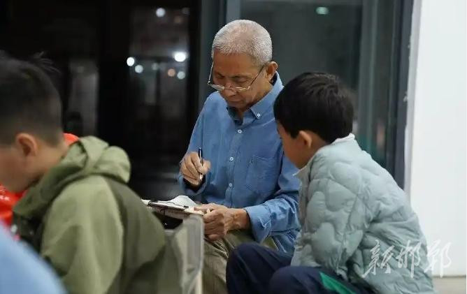 一盏灯、一块黑板、一支粉笔,当夜幕降临,“书法爷爷”李贵江开启了他的“夜生活”——免费教孩子们书法。